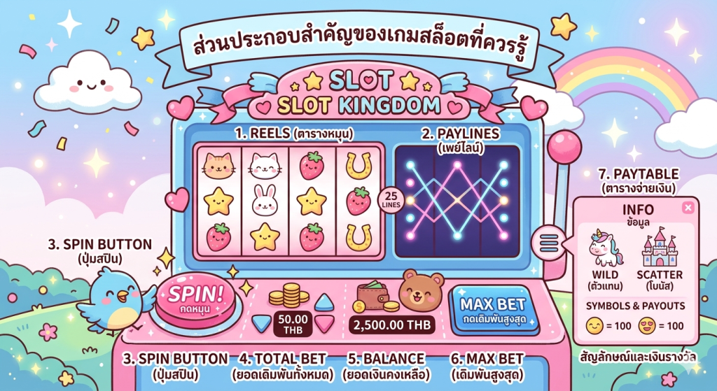 ก่อนเริ่มเล่น ผู้เล่นควรเข้าใจส่วนประกอบหลักของเกมสล็อต เพื่อให้สามารถอ่านรูปแบบเกมและวางแผนการเล่นได้ดีขึ้น
